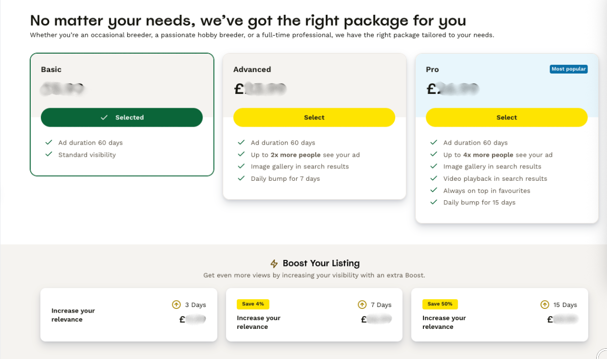 When you publish a listing on Pets4Homes, you have to choose a package to get it live. Your package determines the features your advert includes for the full 60 days it is live.